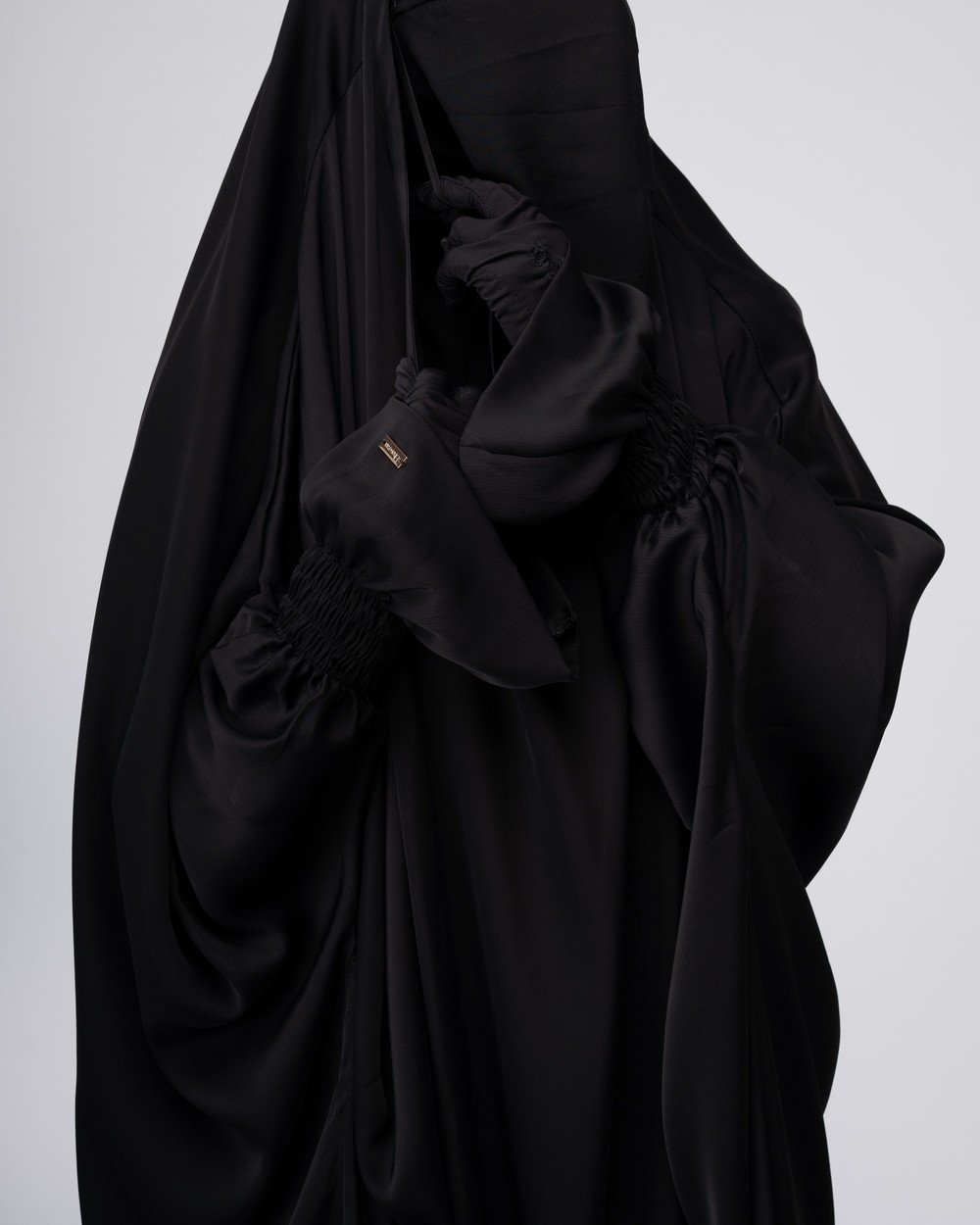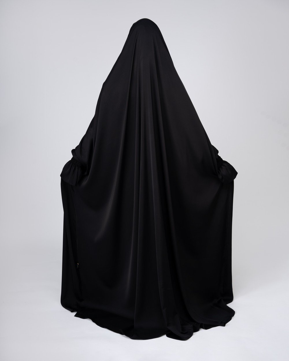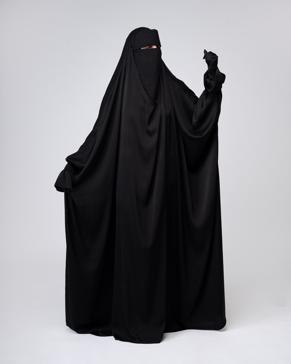 Un jilbeb une pièce couvrant, avec élastiques à la tête et aux poignets, conçu dans un tissu fluide et opaque pour un confort absolu.